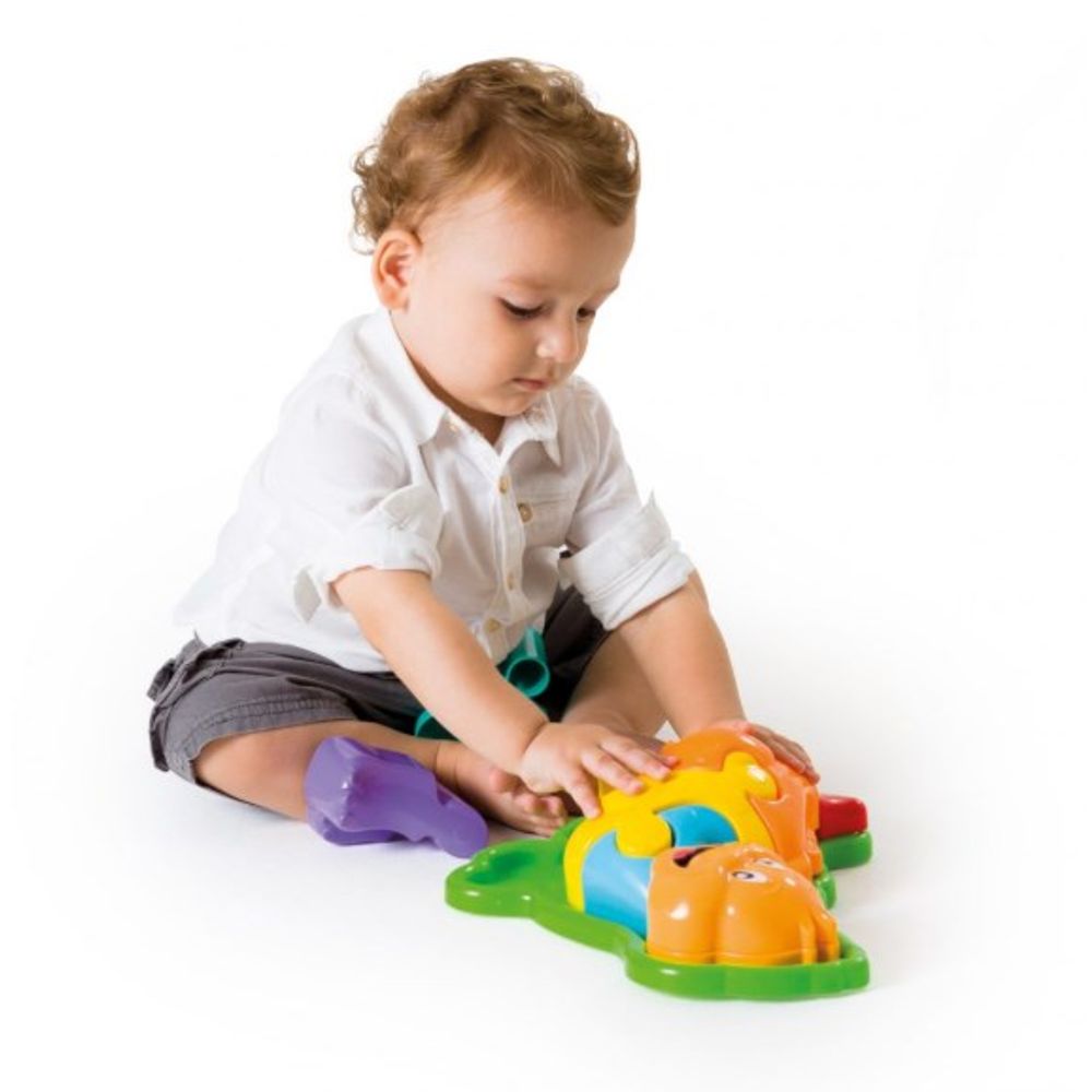 Estimula a coordenação motora, promove o desenvolvimento cognitivo e noções de cores, formas e tamanhos. As peças possuem cores e formas que que despertam a curiosidade dos pequenos. Acompanha peças para brincar e montar o animal e depois é só encaixar o suporte na parte de trás para usar como quadro no quarto dos pequeninos.