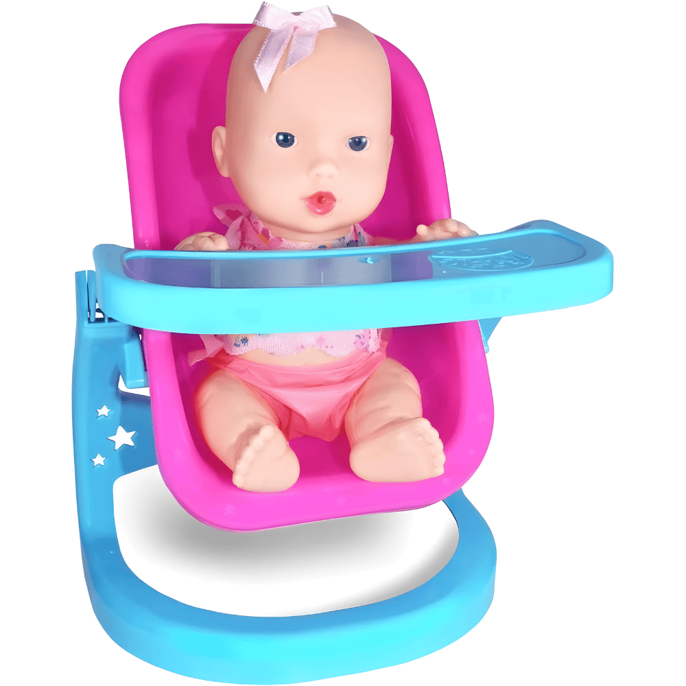 Conteúdo da Embalagem: 01 Boneca, 01 Pratinho de Papinha, 01 Garfinho, 01 Colherzinha, 01 Cadeirinha
