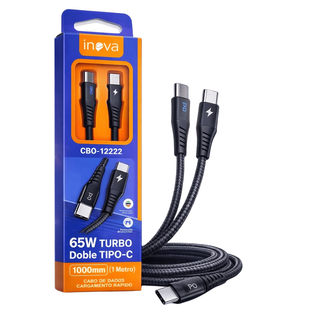 O cabo Turbo 65W Inova é ideal para celulares, tablets e notebooks com entrada Tipo-C, garantindo carregamento rápido e transferência de dados eficiente.