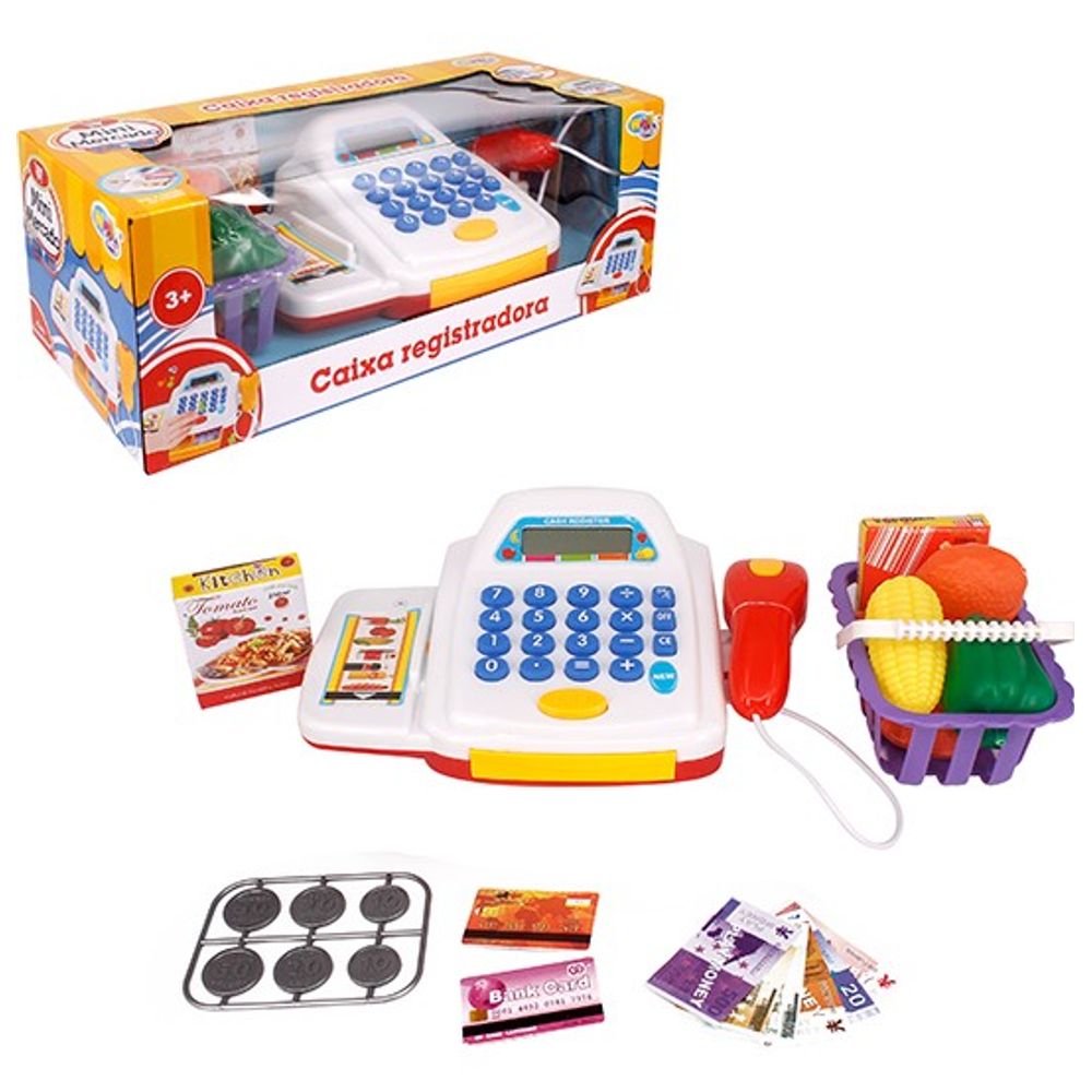 A Caixa Registradora vem com calculadora que realiza as quatro operações de verdade, além de acompanhar, balança, cartão de compras, leitor ótico, gaveta, cédulas de papel em real, moedas, garrafa de água, catchup, leite em caixa e lata, caixa de bolo, frango, pimentão e milho de mentirinha.