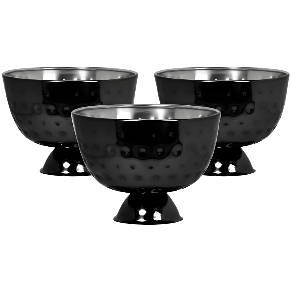 O Jogo de Taças de Sobremesa 3 Peças 180ml Emcasatem é ideal para valorizar cada detalhe na hora de servir. Com capacidade de 180ml cada, são perfeitas para mousses, gelatinas, sorvetes e porções individuais, oferecendo a medida certa para evitar excessos e manter a apresentação equilibrada. Produzidas em aço inox, garantem durabilidade e fácil higienização, enquanto o design com cabo eleva levemente a taça, criando mais destaque na mesa e facilitando o manuseio. O acabamento martelado adiciona textura e personalidade, transformando sobremesas simples em composições mais sofisticadas, seja no dia a dia ou em ocasiões especiais.