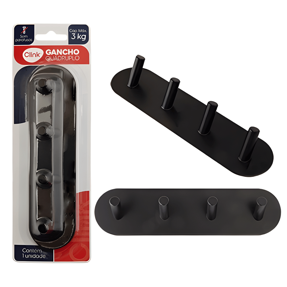 Organização e praticidade se unem no Gancho Quádruplo de Ferro Clink, uma solução inteligente para manter seus ambientes sempre arrumados. Com estrutura resistente e capacidade para suportar até 3 kg, ele é ideal para pendurar utensílios de cozinha, toalhas, roupas, acessórios ou ferramentas, otimizando o espaço de forma funcional. Seu design compacto de 19,2 cm x 4,8 cm x 3 cm combina com qualquer estilo de decoração, trazendo um toque discreto e elegante. Fabricado em ferro de alta durabilidade, o gancho garante longa vida útil e firmeza no uso diário — perfeito para quem valoriza organização e praticidade em cada detalhe do lar.