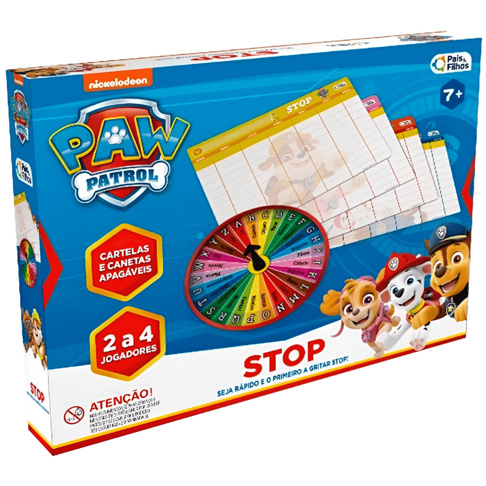 O Stop Patrulha Canina 7+ da Pais e Filhos é a versão temática do clássico jogo de adedanha, trazendo a dinâmica já conhecida de pensar rápido e preencher categorias com palavras iniciadas pela letra sorteada, agora com o universo oficialmente licenciado da Patrulha Canina. A ambientação com os personagens torna a experiência mais envolvente para fãs da animação, aumentando o interesse e a participação durante as partidas. Além de divertido, o jogo estimula raciocínio ágil, vocabulário e concentração, promovendo interação entre crianças e família de forma competitiva e leve. É uma opção que combina aprendizado e entretenimento em um formato simples de organizar e jogar, ideal para reunir todos em torno de um desafio rápido e temático.