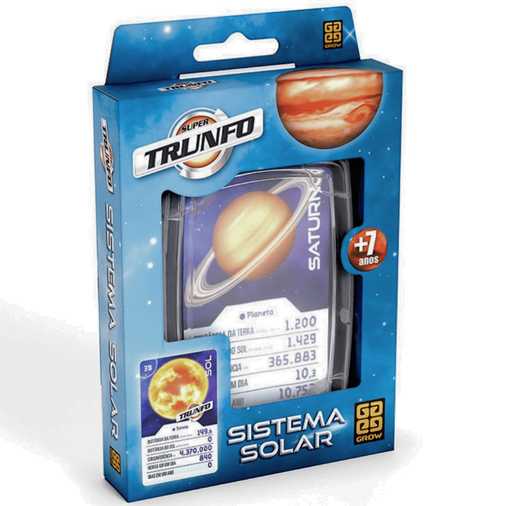 O Super Trunfo Sistema Solar 7+ da Grow transforma o aprendizado sobre os planetas em uma disputa envolvente, onde cada rodada combina estratégia, comparação de dados e conhecimento científico. O jogo utiliza informações como distância da Terra, distância ao Sol, circunferência, duração do dia e do ano de cada planeta, permitindo que os jogadores compreendam melhor as diferenças e curiosidades do Sistema Solar enquanto escolhem o melhor atributo para vencer a rodada. A dinâmica simples facilita a participação de crianças e adultos, tornando a experiência acessível e ao mesmo tempo educativa. É uma opção ideal para reunir família e amigos em torno de uma atividade que estimula raciocínio, tomada de decisão e curiosidade científica, oferecendo diversão inteligente e aprendizado prático sem depender de telas.