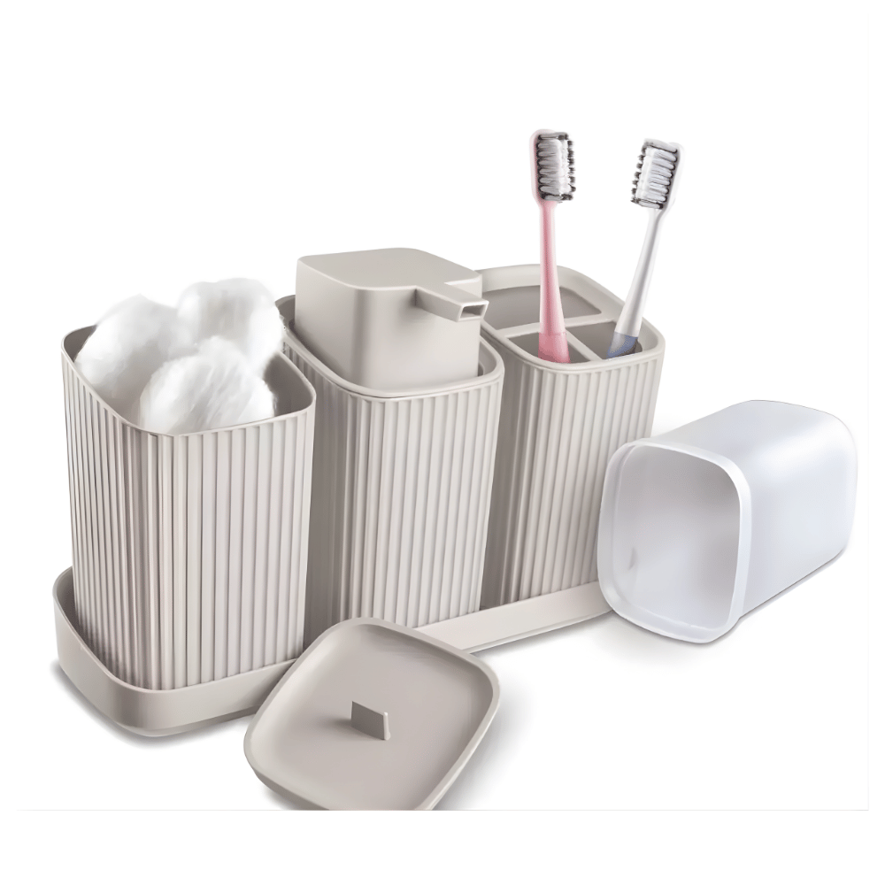 Deixe seu banheiro mais organizado e elegante com o Kit Banheiro 4 Peças Cinza Claro Usual. O conjunto contém dispenser para sabonete líquido, porta escova, saboneteira e porta algodão, todos feitos em plástico durável e fácil de limpar. Com design moderno e acabamento em tom neutro, ele combina praticidade e estilo, tornando o ambiente mais funcional e harmonioso.