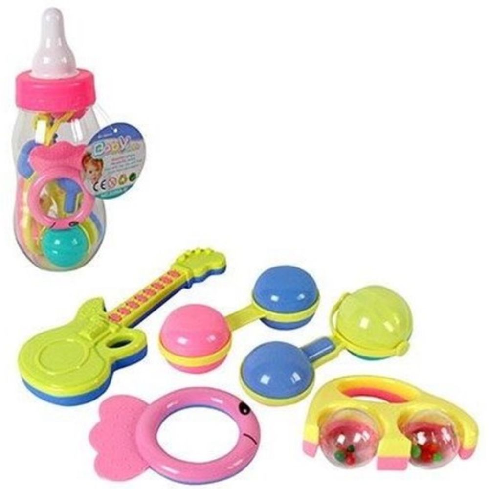 Um kit de chocalhos com 5 peças divertidos para a sua bebê, que vem dentro de uma mamadeira de plástico que serve como um cofre para a criança aprender logo cedo a guardar as suas economias.