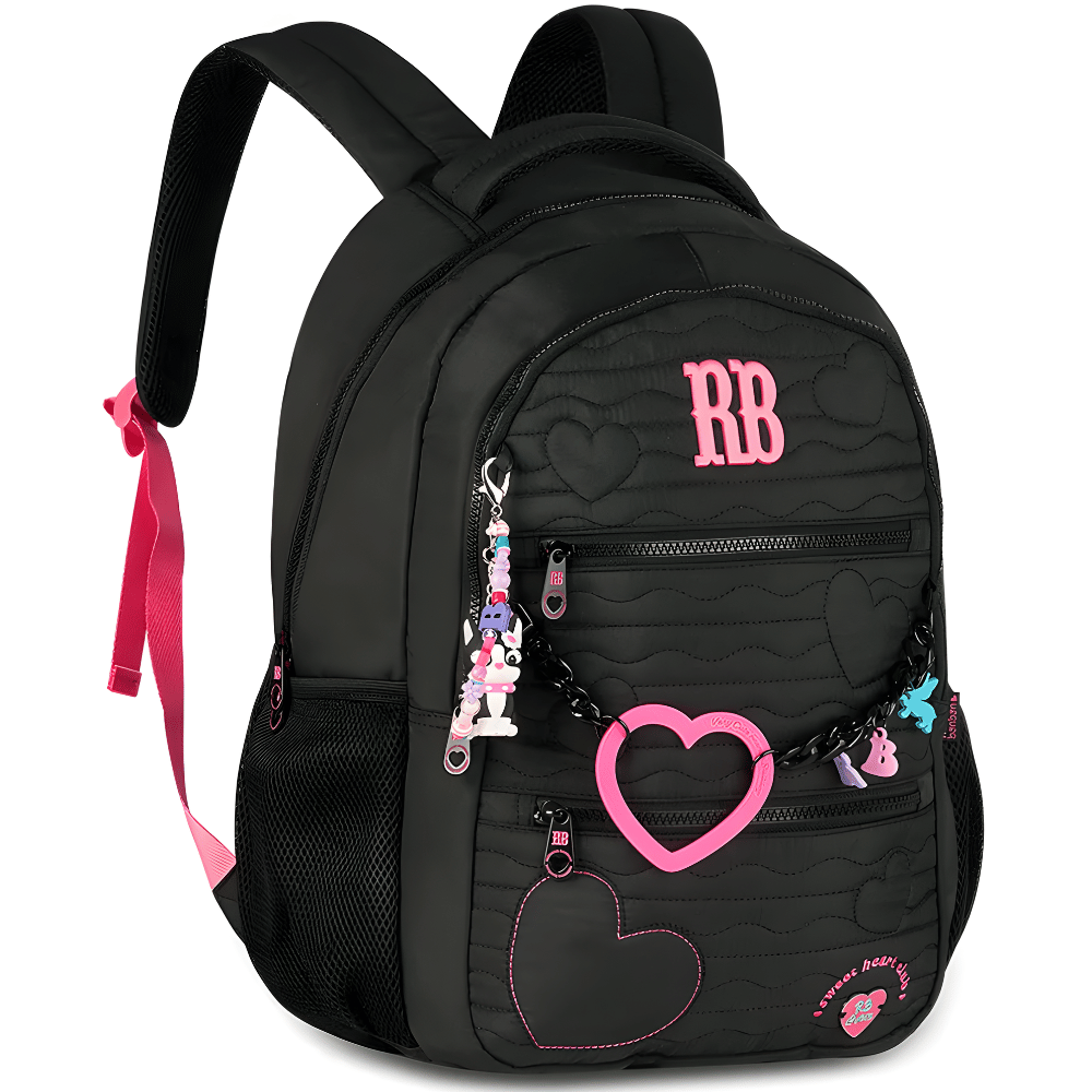 A Mochila de Costas Heart Beats Rebecca Bonbon da Clio é a escolha perfeita para quem busca estilo, funcionalidade e autenticidade. Confeccionada em material soft com elegante matelassê de corações, conta com plaquinha metálica exclusiva e cadarço acetinado colorido que reforçam o charme da linha licenciada Rebecca Bonbon. Acompanha chaveiro de miçangas, mascote 3D e corrente com coração emborrachado, agregando ainda mais personalidade. Com 19 polegadas, oferece alça carona, bolso antifurto e compartimento para laptop, garantindo praticidade e segurança para a rotina escolar ou urbana.