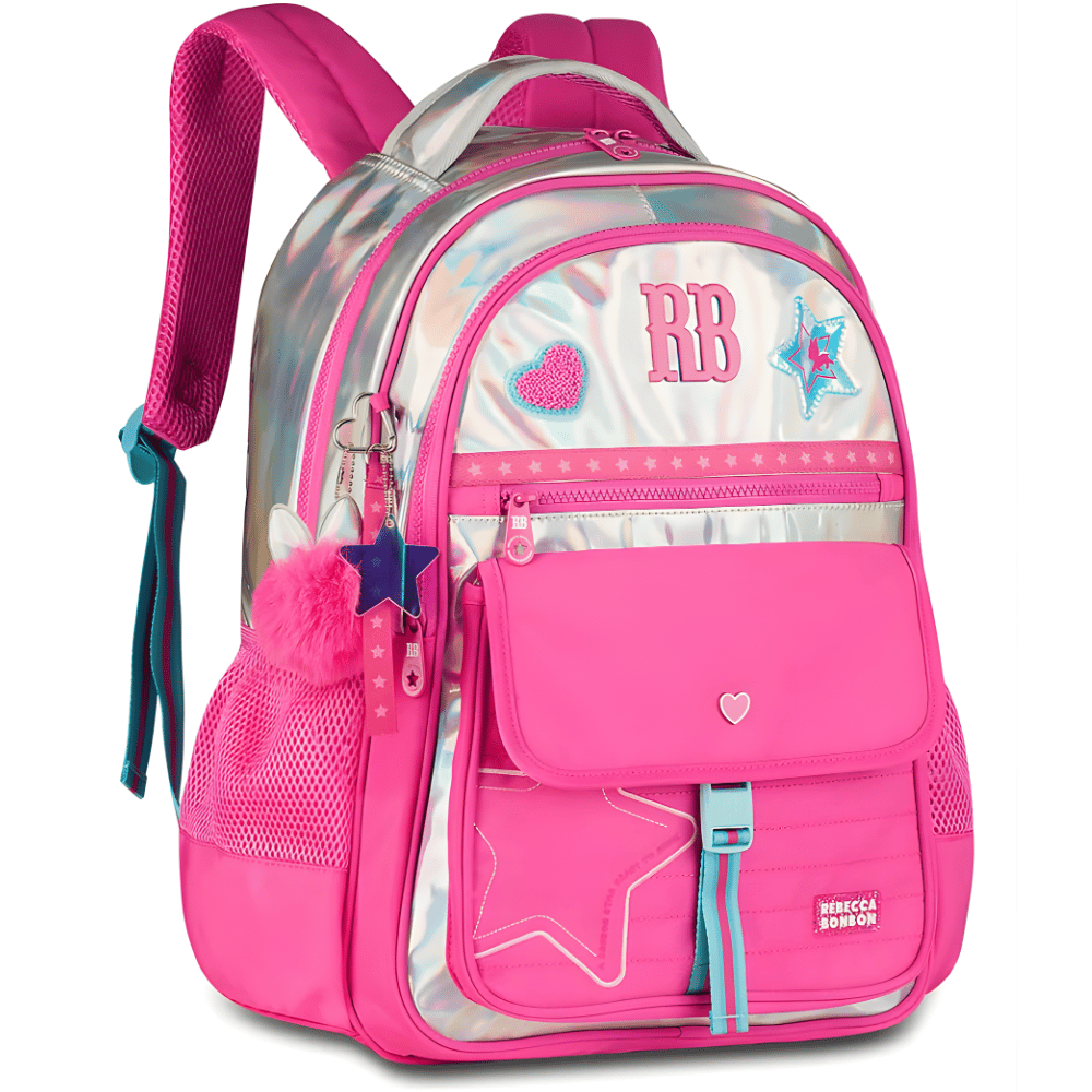 A Mochila de Costas Holográfica Rebecca Bonbon Clio Holo Shine é um produto oficial licenciado, perfeita para quem busca estilo, praticidade e identidade fashion no dia a dia escolar ou em passeios. Produzida em PVC holográfico, traz bordado de estrela, patches no painel frontal e etiqueta de borracha exclusiva da personagem. Acompanha chaveiro pompom com orelhinhas, cadarço e estrela em acrílico, garantindo um visual moderno e encantador. Conta ainda com alça carona para facilitar o transporte e bolso antifurto, oferecendo mais segurança e conforto em todos os momentos. Ideal para fãs da Rebecca Bonbon que não abrem mão de brilho e funcionalidade.