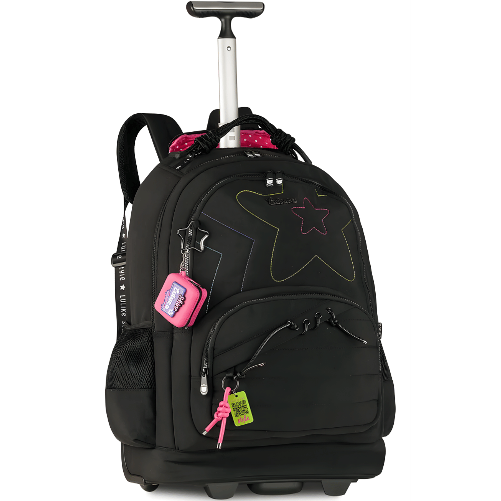 A Mochilete Luluca da Clio é perfeita para quem busca estilo, praticidade e um toque fashion no dia a dia escolar. Confeccionada em poliéster com matelassê de estrela, traz acabamento premium com placa de metal com resina, metais pretos/ônix e strap acetinado personalizado. Conta com alça de mão em corda, chaveiro exclusivo com porta fone e mosquetão em formato de estrela, além de chaveiro fixo em PVC e placa em acrílico com QR Code, reforçando a originalidade do produto licenciado Luluca. Ideal para acompanhar crianças e adolescentes com conforto, organização e muito estilo.