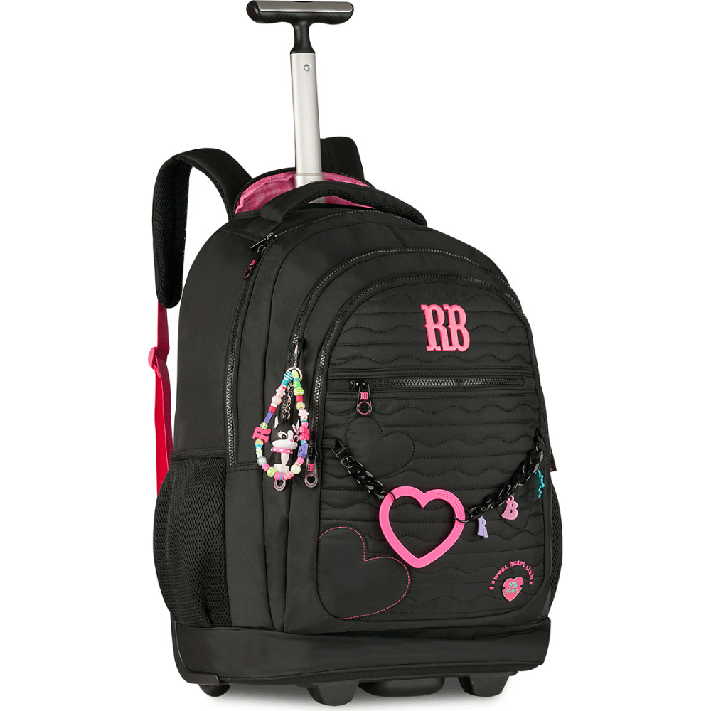 A Mochilete Rebecca Bonbon Heart Beat da Clio é a escolha perfeita para quem busca estilo, praticidade e originalidade em um produto licenciado. Confeccionada em material soft, conta com elegante matelassê de corações, plaquinha de metal e cadarço acetinado colorido que reforçam o visual fashion. Acompanha chaveiro de miçangas, mascote 3D exclusivo e corrente com coração emborrachado, garantindo ainda mais charme. No formato mochila de carrinho, possui 19 polegadas, proteção para rodas, placa de metal colorida e corrente personalizada, oferecendo conforto, durabilidade e um design encantador para o dia a dia escolar.